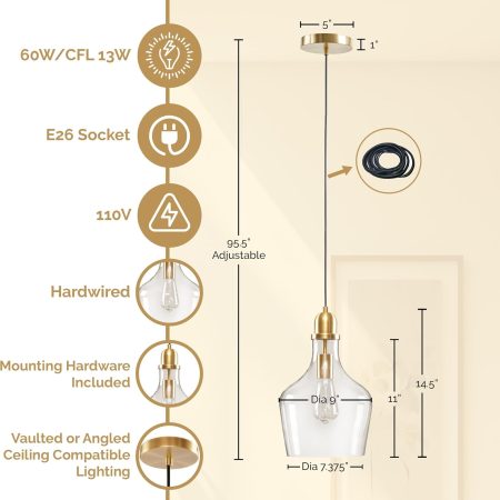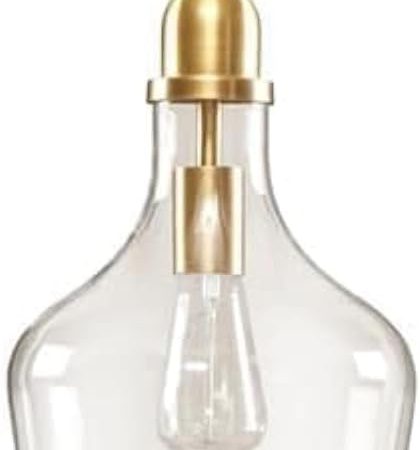 Hampton Hill Auburn Pendant Lighting for Dining Room, Industrial Kitchen Lights, Hand-Blown Glass Bell Shaped Pendant Light for Kitchen Island, Foyer, Bedroom, 9" Dia x 95.5" H, Gold/Clear